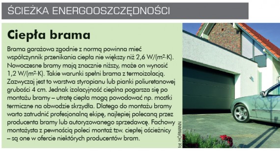 Oszczędności energii służą bramy garażowe o wysokich parametrach termoizolacyjnych. Można kupić bramy z naświetlami, dzięki czemu garaże są także doświetlane światłem naturalnym. Coraz częściej w ogrodach stosujemy lampy solarne, które nie wykorzystują energii elektrycznej.